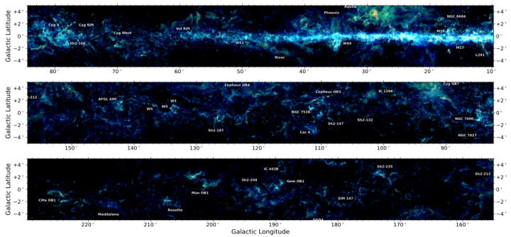 ▲图一:银河画卷C18O、13CO和12CO(1—0)数据合成的红、绿、蓝三色图。图中标识了著名的恒星形成区或气体结构。不同密度环境下的大尺度气体结构和形态各异的分子云细节清晰可见。