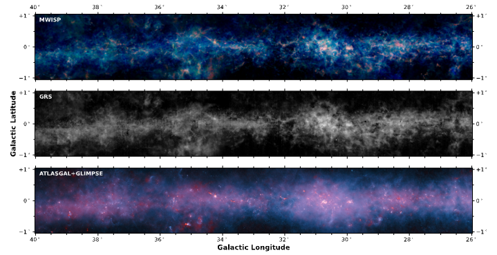 ▲图二:银纬±1度范围内银河画卷巡天与其它巡天的比较图。上图是银河画卷C18O、13CO和12CO(1—0)合成的RGB三色图,表征不同密度的分子气体环境;中图是GRS巡天的13CO(1—0)积分强度图;下图展示了ATLASGAL(870微米,红色)和SpitzerGLIMPSE(24微米,蓝色)的合成图,主要展示银盘上尘埃的热辐射。